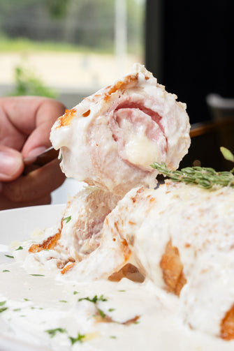 Pollo empanizado relleno de jamón, ricotta, mozzarella, salsa alfredo, reducción de vino blanco