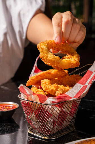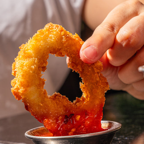 calamares fritos con pomodoro arrabiata y pepperoncini.