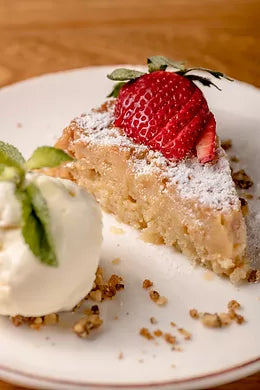 Tierno coco horneado acompañado de nueces caramelizadas, fresa y helado de vainilla