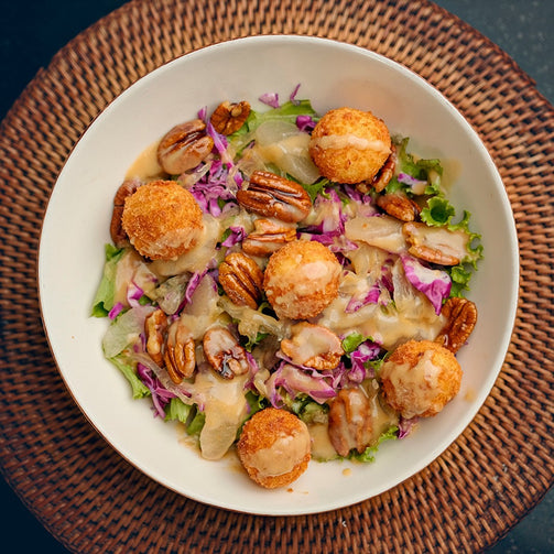 Lechuga mezclum, croquetas de queso de cabra, pera, cebollas caramelizadas, pecanas, vinagreta de pera y miso