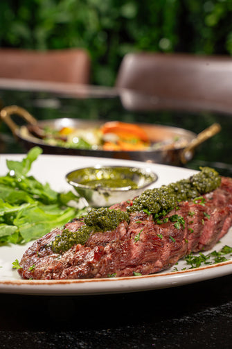 vacio a la parrilla con crema de reducción de vino blanco, albahaca y ralladura de limón